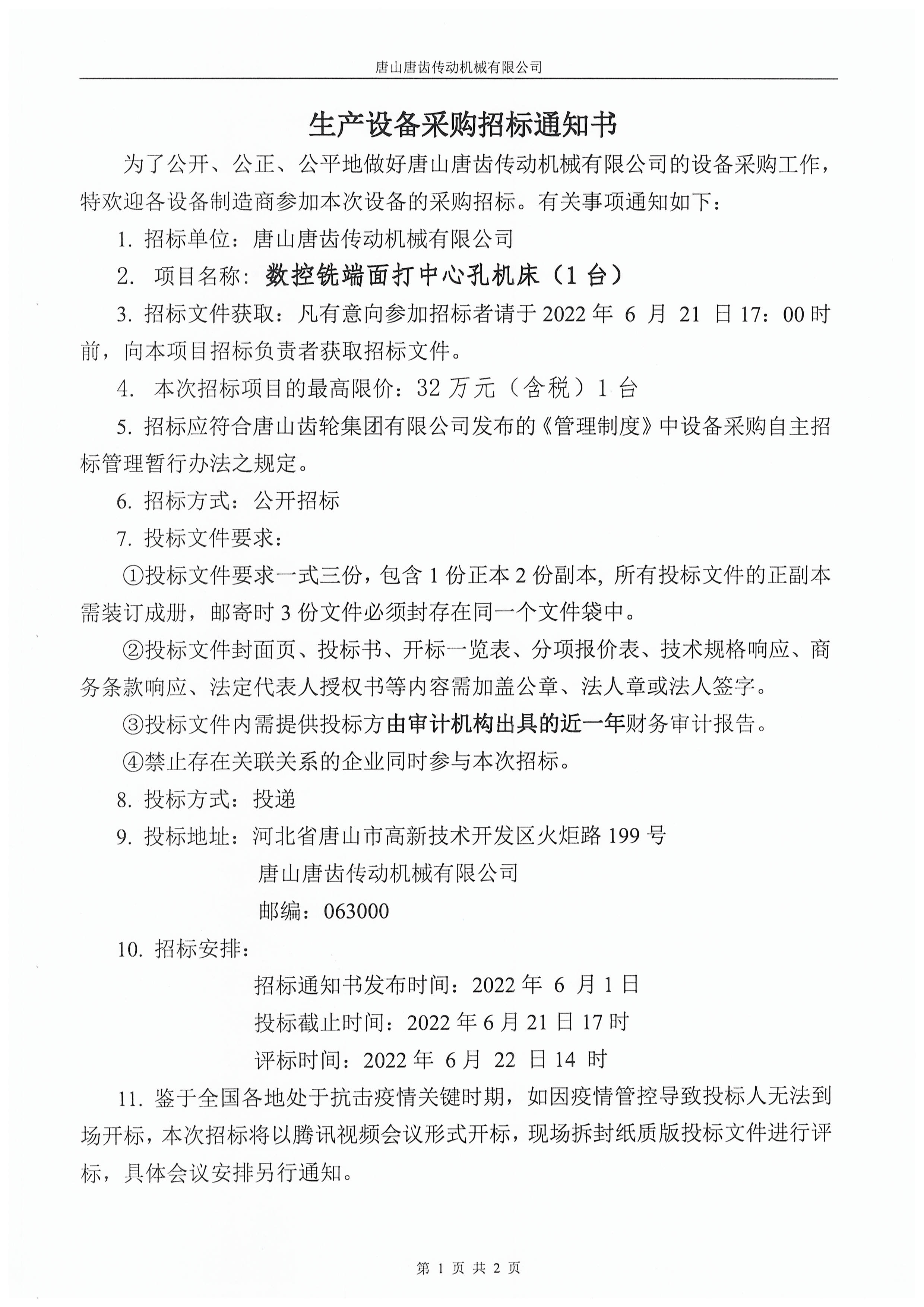 唐山唐齿传动机械有限公司数控铣端面打中心孔设备采购招标公告
