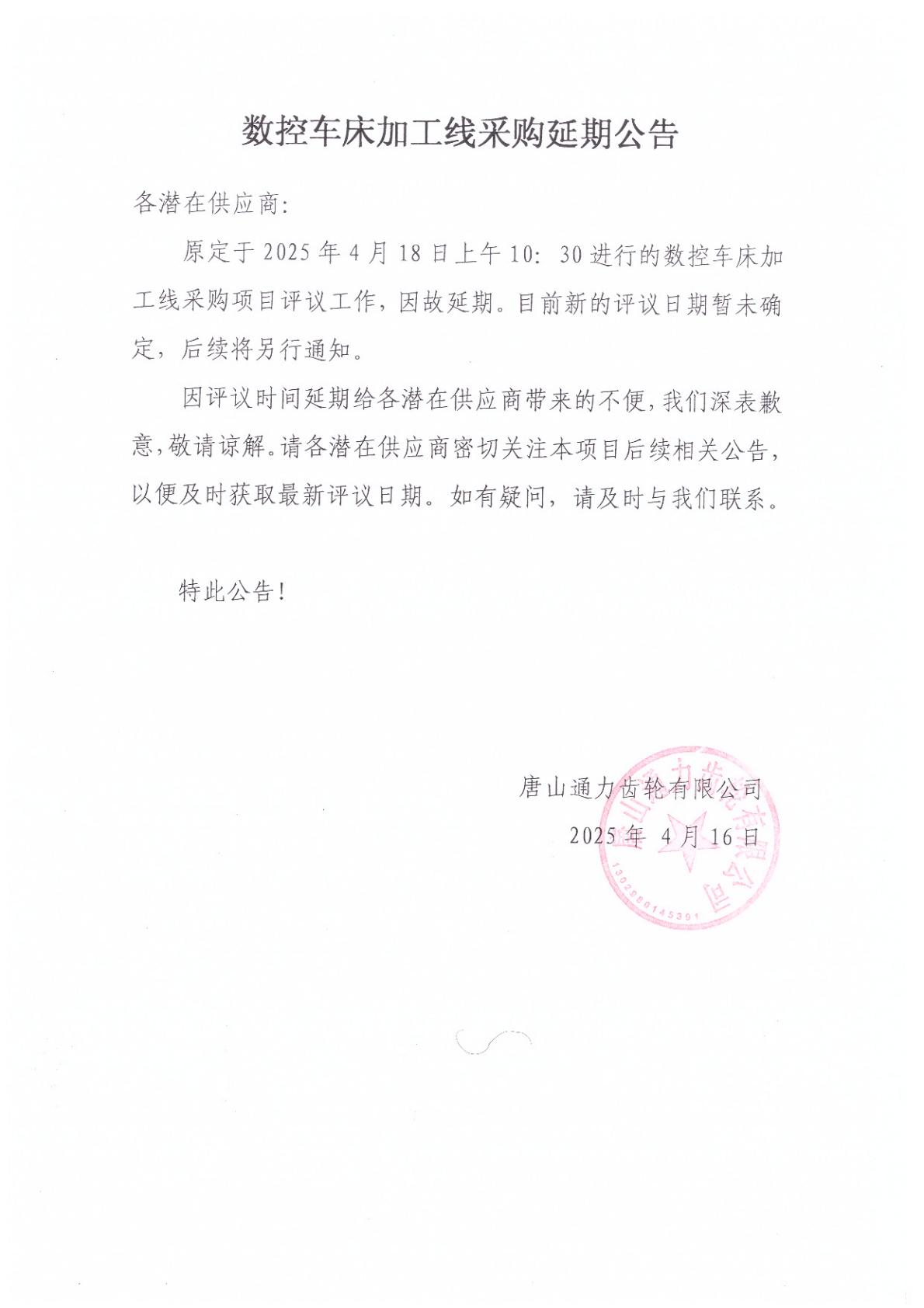 唐山通力齿轮有限公司 数控车床加工线采购延期公告